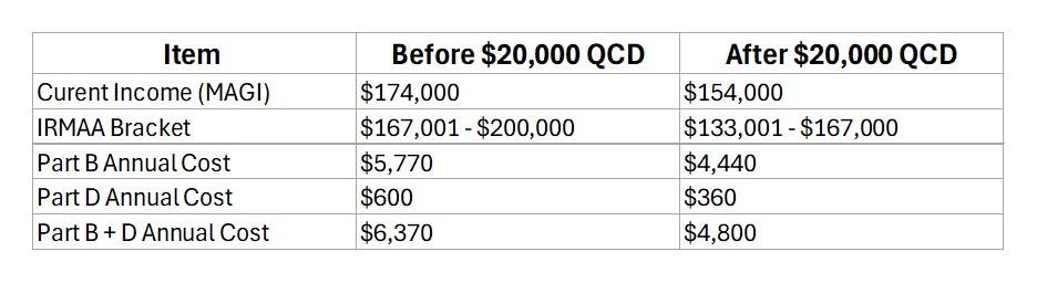 The example below presents typical Medicare costs for an individual with current income of $174,000, and with reduced income of $154,000 after completing a QCD from their retirement account.