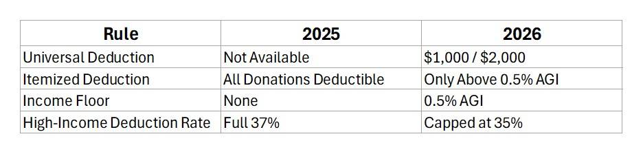 With the One Big Beautiful Bill Act (OBBBA) signed in 2025, the rules for charitable deductions are changing significantly in 2026.